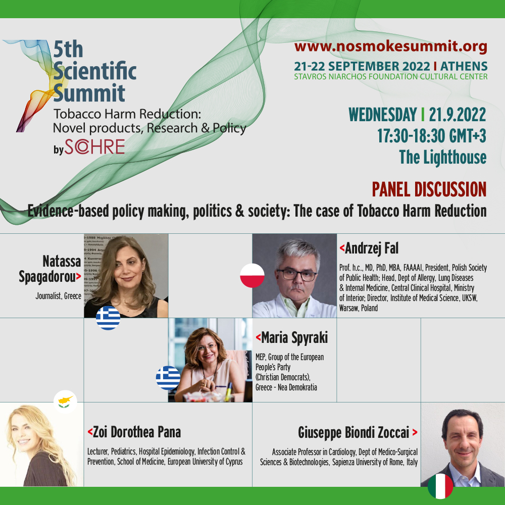 Οι πολιτικές καθοδηγούνται από την αξία που μπορεί να έχουν για την κοινωνία ή από τα επιστημονικά στοιχεία; Πώς καθορίζονται τα «αδιάσειστα αποδεικτικά στοιχεία» για τους πολιτικούς; Πώς θα πρέπει να δρουν οι επιστήμονες όταν τάσσονται υπέρ της δημιουργίας μίας πολιτικής; Πώς εφαρμόζεται αυτό στη Μείωση της Βλάβης από τον Καπνό; Η συζήτηση αυτή θα αποτελέσει το θέμα του panel στο οποίο θα συμμετέχουν η ευρωβουλευτής Μαρία Σπυράκη και τρεις διακεκριμένοι επιστήμονες (Ζωή-Δωροθέα Πανά, Κύπρος, Andrzej Fal, Πολωνία, και Giuseppe Biondi Zoccai, Ιταλία), που θα επιχειρήσουν να παρουσιάσουν διεξοδικά όλο το φάσμα των πολλαπλών διαστάσεων του εν λόγω ζητήματος.
