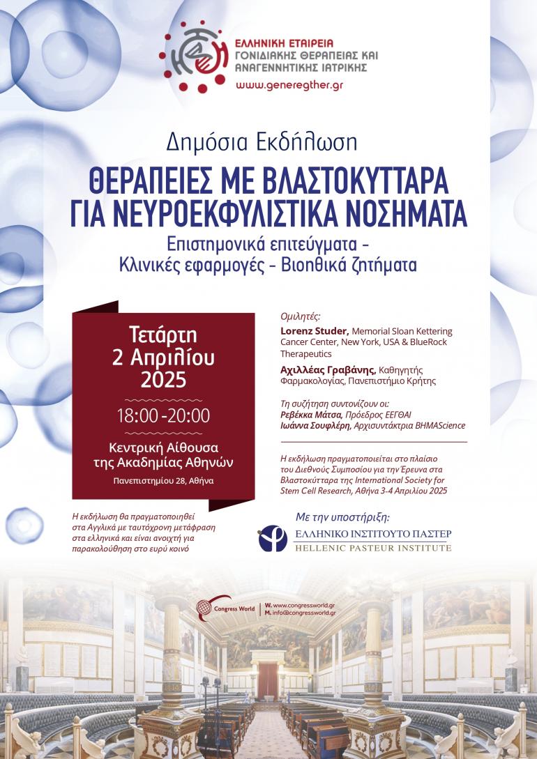 Σε αυτό το πλαίσιο, η Ελληνική Εταιρεία Γονιδιακής Θεραπείας και Αναγεννητικής Ιατρικής (ΕΕΓΘΑΙ), με την υποστήριξη του Ελληνικού Ινστιτούτου Παστέρ, διοργανώνει την Τετάρτη 2 Απριλίου 2025, στις 18:00-20:00, μια εξαιρετική εκδήλωση με τίτλο «Θεραπείες με Βλαστοκύτταρα για Νευροεκφυλιστικά Νοσήματα»στην Κεντρική Αίθουσα της Ακαδημίας Αθηνών (Πανεπιστημίου 28). Η εκδήλωση είναι ανοιχτή στο κοινό. Η είσοδος είναι ελεύθερη, θα διεξαχθεί στα αγγλικά με ταυτόχρονη μετάφραση στα ελληνικά και εντάσσεται στο πλαίσιο του ISSCR Athens International Symposium on Neural Stem Cells, που πραγματοποιείται στις 3–4 Απριλίου υπό την αιγίδα της Διεθνούς Εταιρείας για την Έρευνα στα Βλαστοκύτταρα (ISSCR). Τη συζήτηση θα συντονίσουν η Ρεβέκκα Μάτσα και η Ιωάννα Σουφλέρη, Αρχισυντάκτρια του ΒΗΜΑScience.