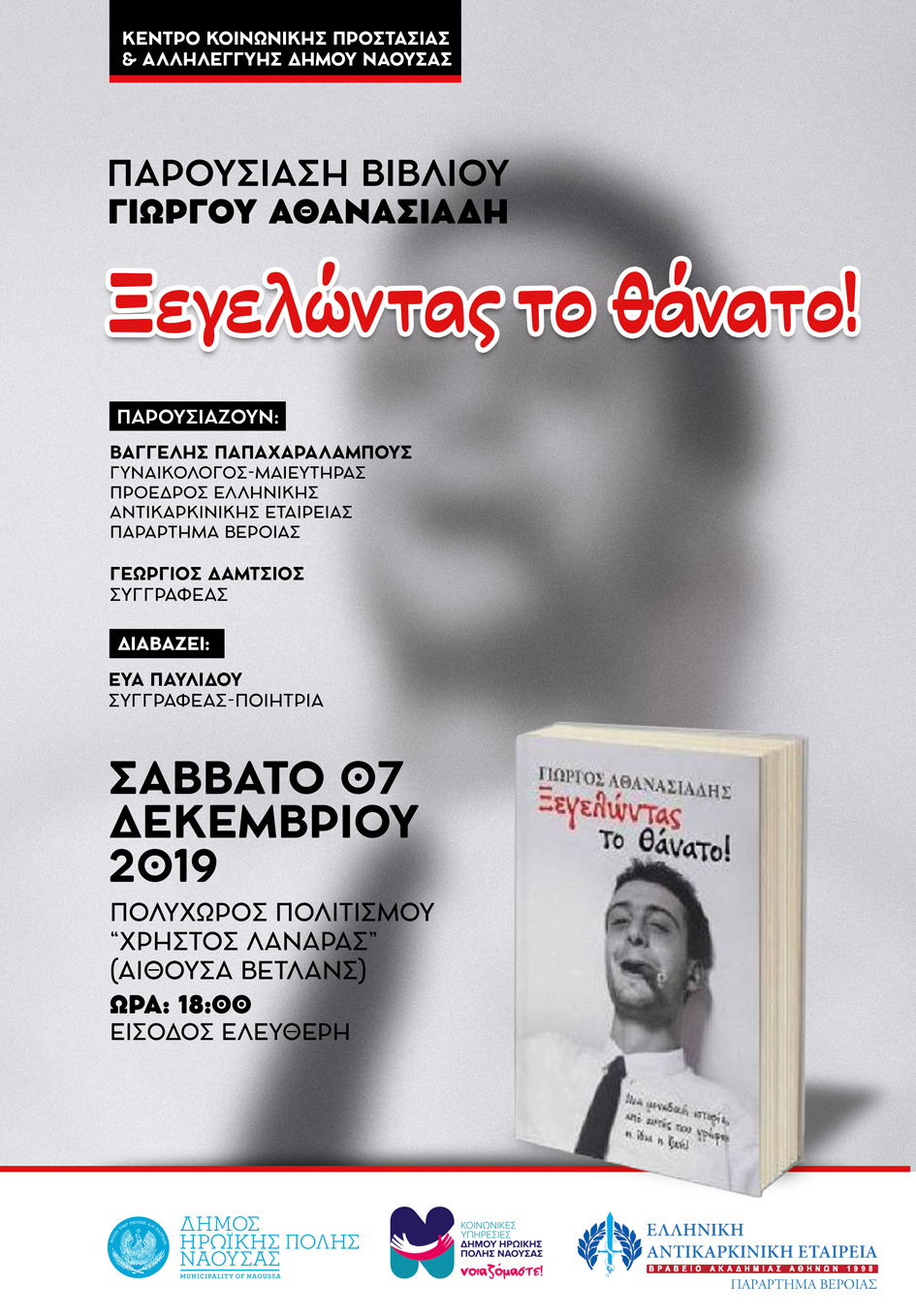 Το Σάββατο 7 Δεκεμβρίου 2019 (ώρα: 1800), στον Πολυχώρο Πολιτισμού «Χρήστος Λαναράς» θα δώσει ενεργά το παρόν στην παρουσίαση του βιβλίου «Ξεγελώντας το Θάνατο», το οποίο αποτελεί όχι απλά την αυτοβιογραφία του καρκινοπαθούς συγγραφέα, αλλά κυρίως εξυμνεί, με συχνά αυθάδη τρόπο, τον αγώνα του θνητού ανθρώπου ενάντια στο στερεότυπο της ματαιότητας της ζωής.Το βιβλίο αναπόφευκτα αποπειράται να θέσει το ερώτημα της πεμπτουσίας της ύπαρξης του ανθρώπου, κάτι το οποίο καταφέρνει να απαντήσει με συντριπτικά ρεαλιστικό τρόπο.