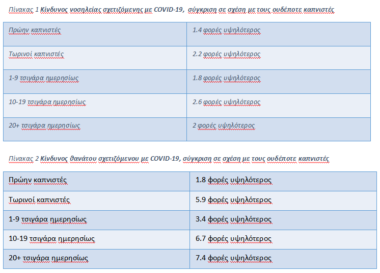 Μάλιστα παραθέτοντας τα αποτελέσματα έρευνας του Πανεπιστημίου της Οξφόρδης που δημοσιεύθηκε τον Σεπτέμβριο του 2021 (Clift, Ashley K, Adam von Ende, Pui San Tan, Hannah M Sallis, Nicola Lindson, Carol A C Coupland, Marcus R Munafò, Paul Aveyard, Julia Hippisley-Cox, and Jemma C Hopewell. 2021. "Smoking and COVID-19 outcomes: an observational and Mendelian randomisation study using the UK Biobank cohort". Thorax. thoraxjnl-2021-217080.), ανέφερε ότι διαπιστώνεται πως το κάπνισμα σχετίζεται με αυξημένο κίνδυνο νοσηλείας και θανάτου από COVID-19, σε σχέση με ανθρώπους που δεν έχουν καπνίσει ποτέ (πίνακας 1 και πίνακας 2):