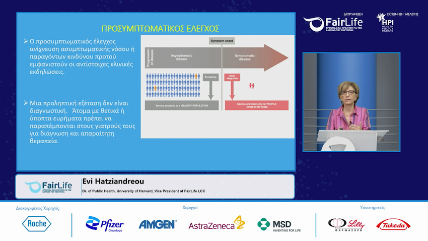 Η κα. Εύη Χατζηανδρέου, Δρ. Δημόσιας Υγείας Παν/μιο Harvard, Αντιπρόεδρος FairLife LCC, επεσήμανε ότι οι δαπάνες για την πρόληψη στην ΕΕ είναι 2,8% των συνολικών δαπανών υγείας ένα πολύ μικρό ποσοστό μικρότερο και του αντίστοιχου που δαπανάται για τη διοίκηση του Συστήματος. Μετά και την παρουσίαση των αποτελεσμάτων της μελέτης, ο προσυμπτωματικός έλεγχος για τον καρκίνο του πνεύμονα ανταποκρίνεται σε όλα τα κριτήρια που έχουν τεθεί από Διεθνείς Οργανισμούς και Συστήματα Υγείας ως προς την υιοθέτηση Προγραμμάτων για επιμέρους ασθένειες. Τόνισε όμως την ανάγκη της σωστής και ολοκληρωμένης σχεδίασης και υλοποίησης για να αξιοποιηθεί στο μέγιστο το όφελος που προσφέρει. Ειδικά δε στη χώρα μας, όπου ο καρκίνος του πνεύμονα είναι η πρώτη αιτία θανάτου με παραπάνω θανάτους από τον καρκίνο του μαστού, του παχέος εντέρου και του προστάτη, όλων μαζί και 9.000 νέες περιπτώσεις κάθε χρόνο θα αποτελέσει ένα δυνατό όπλο στη μάχη της δευτερογενούς πρόληψης.