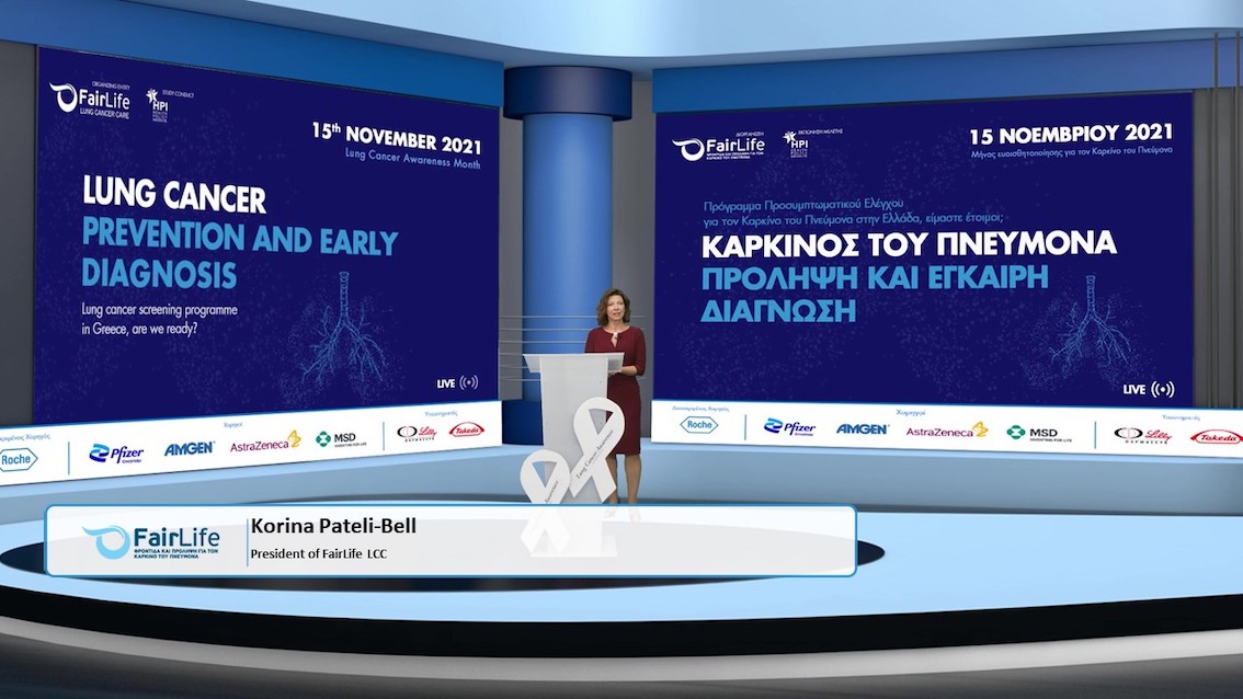 Η πρόεδρος της FairLife LCC και μέλος ΔΣ του ευρωπαϊκού φορέα συλλόγων ασθενών LuCE κα. Κορίνα Πατέλη Bell αναφέρθηκε στην ίδρυση της FairLife και τους στόχους της, ευχαρίστησε όλους τους συμμετέχοντες και υπενθύμισε ότι μόνο το 16% των ασθενών ανιχνεύονται στο αρχικό στάδιο της νόσου. Όπως χαρακτηριστικά δήλωσε, για να δώσει έμφαση στην έγκαιρη διάγνωση: «Mπορείς να το προλάβεις! Μην αναβάλεις τις εξετάσεις! Όποιος έχει πνεύμονες μπορεί να νοσήσει από Καρκίνο του Πνεύμονα».