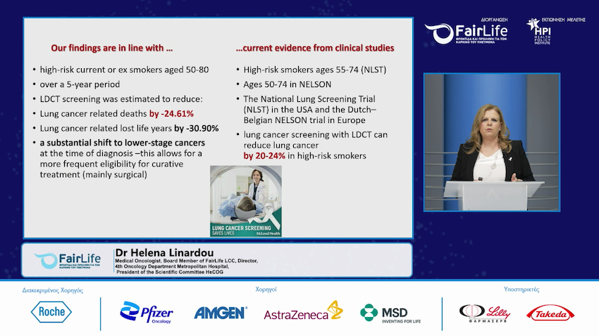 Όπως επεσήμανε η κα. Έλενα Λινάρδου, Παθολόγος Ογκολόγος, Mέλος Δ.Σ. FairLife LCC και Δ/ντρια Δ΄ Ογκολογικής Κλινικής, Νοσοκομείο Metropolitan, Πρόεδρος Επιστημονικής Επιτροπής EΣΟΟ, η βιωσιμότητα για τον καρκίνο του πνεύμονα φθάνει στους 9 στους 10 αν διαγνωστούν εγκαίρως ενώ αντιθέτως αν η διάγνωση καθυστερήσει (στάδιο ΙV) η επιβίωση είναι 1 στους 10. Η κα. Λινάρδου τόνισε πως πλέον τα δεδομένα για τα οφέλη του προσυμπτωματικού ελέγχου είναι αδιαμφισβήτητα και αυτό που πρέπει να μας απασχολήσει πλέον είναι ο τρόπος με τον οποίο θα εφαρμοστεί το μοντέλο του, ενώ ότι με παράλληλη δράση του screening μαζί με προγράμματα μείωσης του καπνίσματος αναμένεται να έχουμε μείωση θανάτων κατά 38%. Η κα. Λινάρδου επίσης πρότεινε τη δημιουργία ειδικών κέντρων αντιμετώπισης του καρκίνου του πνεύμονα, στα οποία να εντάσσονται και τα ιατρεία Διακοπής Καπνίσματος.