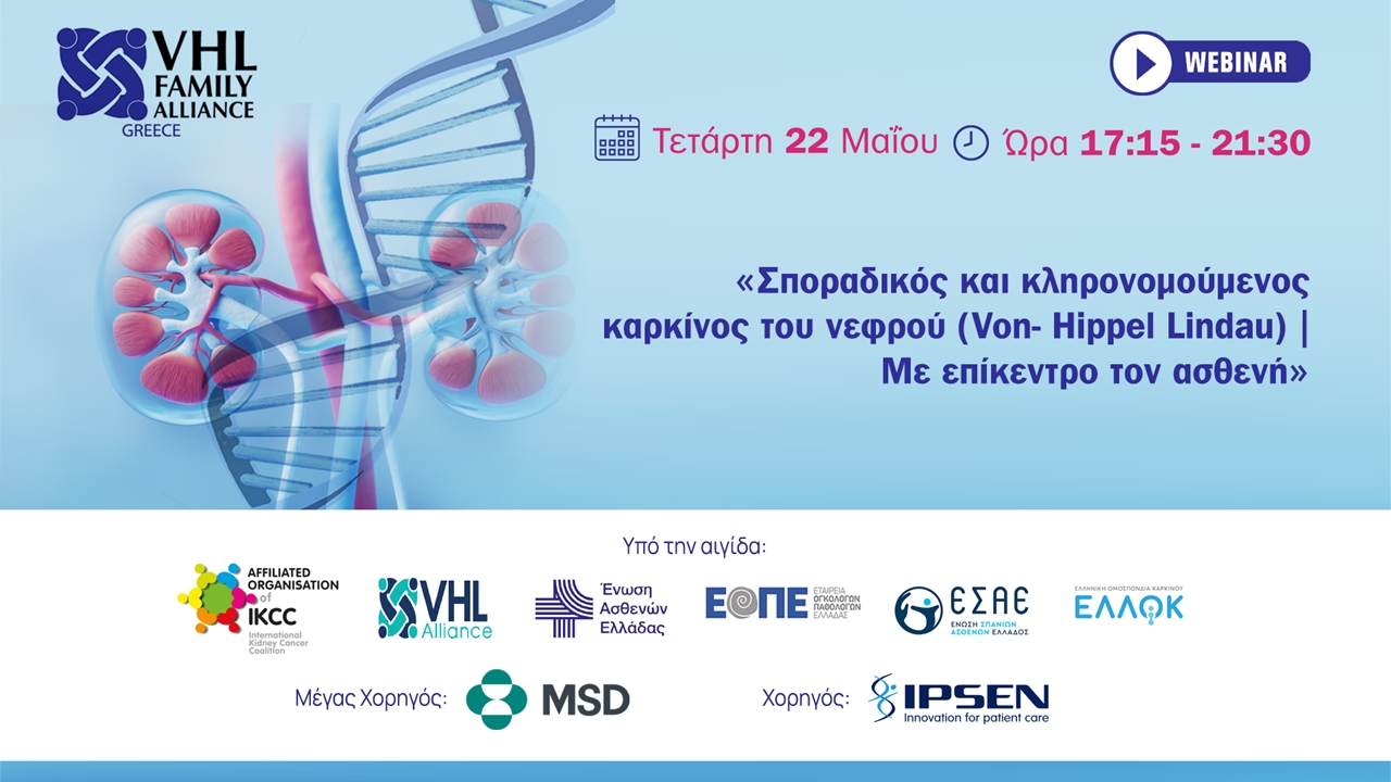 Σημαντικά θέματα ανέδειξε η διαδικτυακή εκδήλωση με θέμα «σποραδικός και κληρονομούμενος καρκίνος του νεφρού (Von – Hippel Lindau) με επίκεντρο τον ασθενή» που οργάνωσε η Οικογενειακή Συμμαχία κατά της νόσου V.H.L Ελλάδος την Τετάρτη 22 Μαΐου 2024. Στην εκδήλωση συμμετείχαν κορυφαίοι επιστήμονες από την Ελλάδα και το εξωτερικό οι οποίοι παρουσίασαν πολύ ενδιαφέροντα στοιχεία σχετικά με τη νόσο.