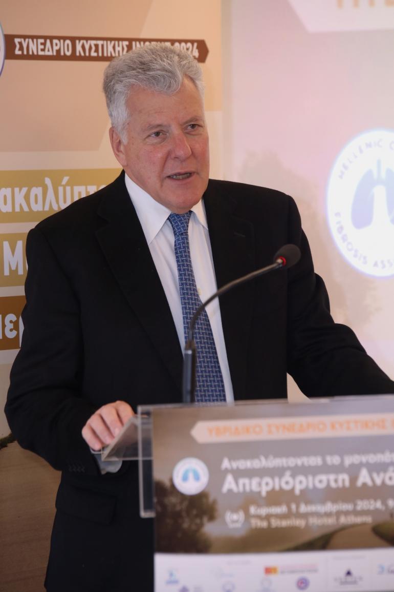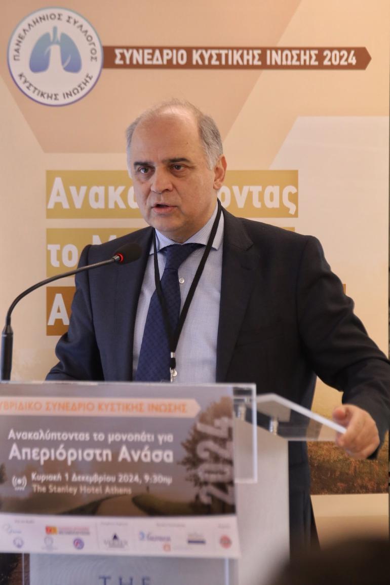 Ο Πρόεδρος Εθνικού Οργανισμού Φαρμάκων (ΕΟΦ), Ευάγγελος Μανωλόπουλος, κατά τον χαιρετισμό του αναφέρθηκε στις εντυπωσιακές εξελίξεις στον τομέα της θεραπείας της Κυστικής Ίνωσης, τονίζοντας ότι «ο ΕΟΦ προσπαθεί να συμβάλει με ταχείες εγκρίσεις όλων των φαρμάκων και διαδικασιών, ώστε οι νέες θεραπείες να φτάνουν γρήγορα στους ασθενείς». Τόνισε τη σταθερή συνεργασία με το Υπουργείο Υγείας και τον Πανελλήνιο Σύλλογο Κυστικής Ίνωσης για τη βελτίωση της ποιότητας ζωής των ασθενών, υπογραμμίζοντας τη σημασία της γονιδιακής θεραπείας και των καινοτόμων φαρμάκων στη βελτίωση της ζωής των ασθενών.