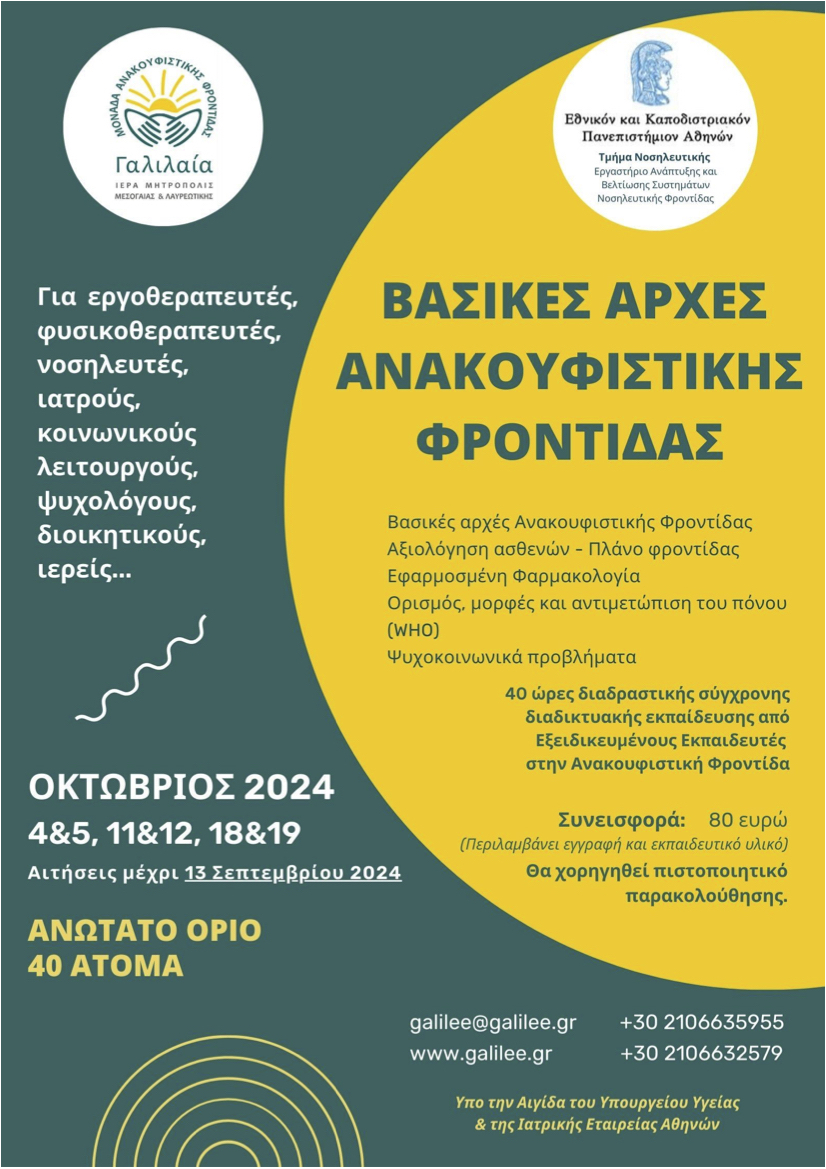 Για 16η συνεχή χρονιά η Μονάδα Ανακουφιστικής Φροντίδας «ΓΑΛΙΛΑΙΑ» και το Εργαστήριο Ανάπτυξης και Βελτίωσης Συστημάτων Νοσηλευτικής Φροντίδας του Τμήματος Νοσηλευτικής ΕΚΠΑ, δίνουν την δυνατότητα σε επαγγελματίες υγείας να γνωρίσουν την Ανακουφιστική Φροντίδα και να συμμετάσχουν στο Σεμινάριο με θέμα: «Βασικές Αρχές στην Ανακουφιστική Φροντίδα».