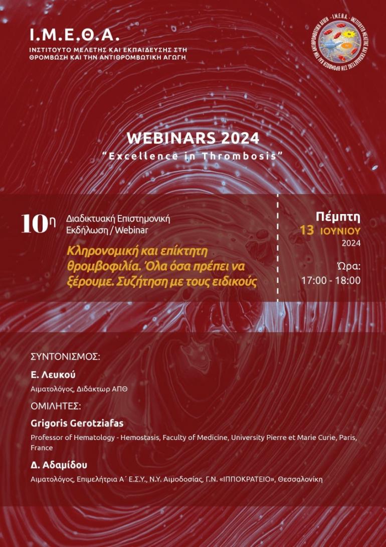 Την Πέμπτη 13 Ιουνίου 2024 (ώρα 17:00 - 18:00) θα πραγματοποιηθεί το 10ο Διαδικτυακό Σεμινάριο του ΙΜΕΘΑ (Ινστιτούτο Μελέτης και Εκπαίδευσης στη Θρόμβωση και την Αντιθρομβωτική Αγωγή) στο πλαίσιο των Webinars 2023 - 2024 «Excellence in Thrombosis». Το Webinar έχει τίτλο: «Κληρονομική και επίκτητη θρομβοφιλία. Όλα όσα πρέπει να ξέρουμε. Συζήτηση με τους ειδικούς» και η συμμετοχή είναι δωρεάν.