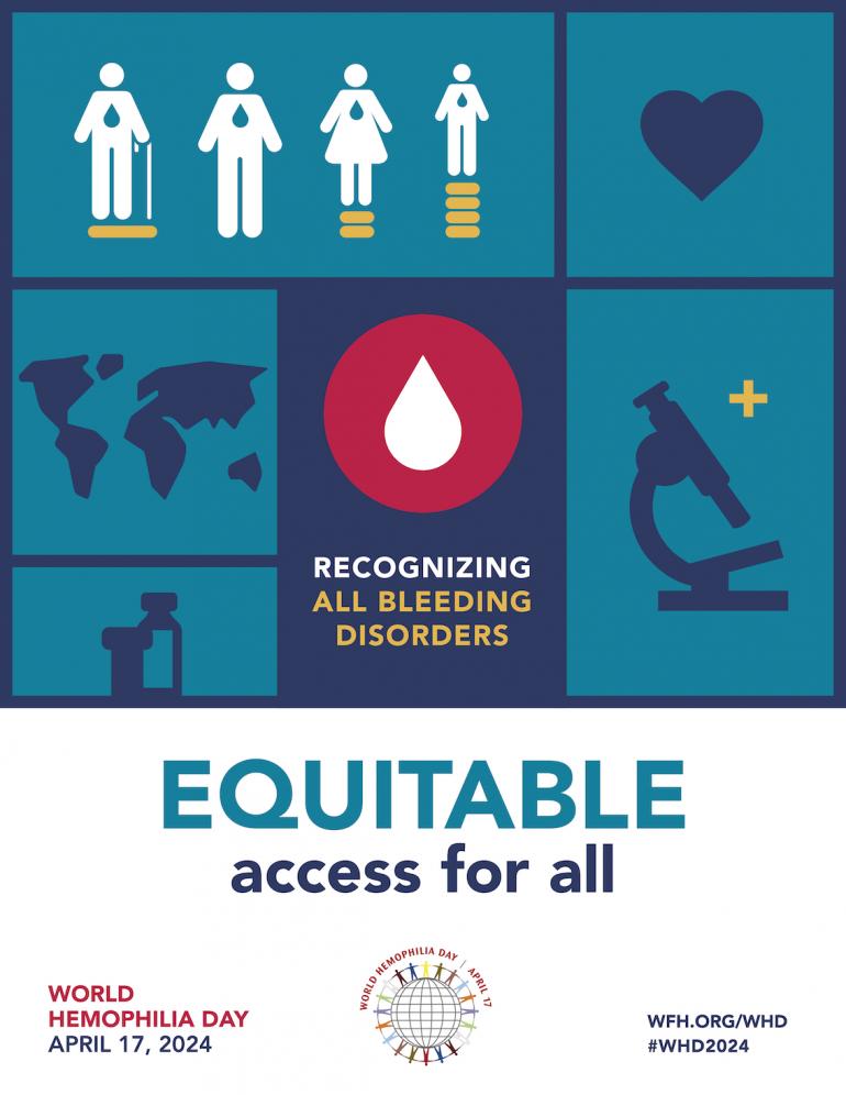 Το μήνυμα της φετινής Παγκόσμιας Ημέρας Αιμορροφιλίας είναι «Ισότιμη πρόσβαση για όλους: Αναγνώριση όλων των αιμορραγικών διαταραχών». Με αυτό το μήνυμα ο Παγκόσμιος Οργανισμός Αιμορροφιλίας αναδεικνύει την ανάγκη να εξασφαλιστεί η ισότιμη πρόσβαση των ασθενών σε διάγνωση, νέες καινοτόμες θεραπείες και ολοκληρωμένη φροντίδα, ανεξάρτητα από τον τύπο της αιμορραγικής διαταραχής, το φύλο, την ηλικία ακόμα και τον τόπο διαμονής τους.