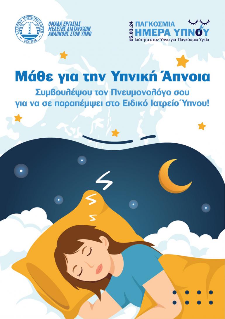 «Μάθε για την Υπνική Άπνοια. Συμβουλέψου τον Πνευμονολόγο σου για να σε παραπέμψει στο Ειδικό Ιατρείο Ύπνου». Αυτό είναι φέτος, με αφορμή την Παγκόσμια Ημέρα Ύπνου, το μήνυμα της Ομάδας Εργασίας της Ελληνικής Πνευμονολογικής Εταιρείας για τη «Μελέτη διαταραχών αναπνοής στον ύπνο». Στόχος της ΕΠΕ είναι να τονίσει τη σημασία που έχει η έγκαιρη διάγνωση και θεραπεία της αποφρακτικής υπνικής άπνοιας από τον ειδικό Ιατρό Ύπνου.