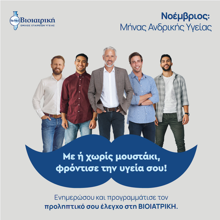 Μια καλή ευκαιρία σε όλους τους άνδρες να φροντίσουν για την υγεία τους προτείνει ο Όμιλος ΒΙΟΙΑΤΡΙΚΗ που με το σύνθημα: «με ή χωρίς μουστάκι!» παρέχει, για τον μήνα Νοέμβριο, εξειδικευμένα πακέτα εξετάσεων για άνδρες κάθε ηλικίας.