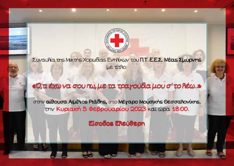 Ο Ελληνικός Ερυθρός Σταυρός, την Κυριακή 5 Φεβρουαρίου 2023, και ώρα 18:00, στην αίθουσα «Αιμίλιος Ριάδης» του Μεγάρου Μουσικής Θεσσαλονίκης διοργανώνει μουσική συναυλία της Μικτής Χορωδίας Ενηλίκων του Περιφερειακού Τμήματος Νέας Σμύρνης του Ελληνικού Ερυθρού Σταυρού, με τίτλο: «’Ο,τι έχω να σου πω, με τα τραγούδια μου σ’ το λέω…».