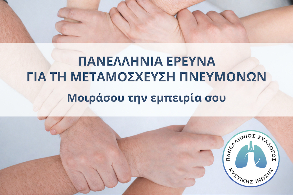Έρευνα σε όλη την Ελλάδα για τη μεταμόσχευση πνευμόνων διεξάγει ο Πανελλήνιος Σύλλογος Κυστικής Ίνωσης, με στόχο την καταγραφή των εμπειριών, των αναγκών, των σκέψεων και των προβληματισμών ασθενών με αναπνευστικές παθήσεις και των φροντιστών τους.