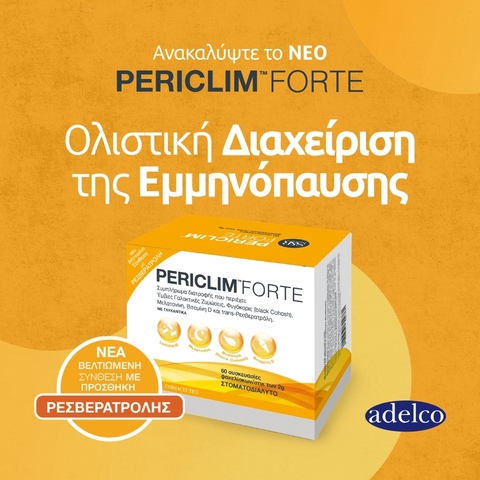 Το Periclim Forte αποτελεί μια ολοκληρωμένη, φυσική και επιστημονικά ενισχυμένη πρόταση για τη συνολική διαχείριση όλων των συμπτωμάτων της εμμηνόπαυσης, χωρίς ορμονική δράση. Συνδυάζει φυγόκορι Black Cohosh, μελατονίνη, βιταμίνη D3, Lactobacillus crispatus, Lactobacillus gasseri και trans-ρεσβερατρόλη, συμβάλλοντας στην ανακούφιση από εξάψεις και εφίδρωση, στη βελτίωση του ύπνου, στη διατήρηση της φυσιολογικής χλωρίδας του κόλπου και στην υποστήριξη της διάθεσης.