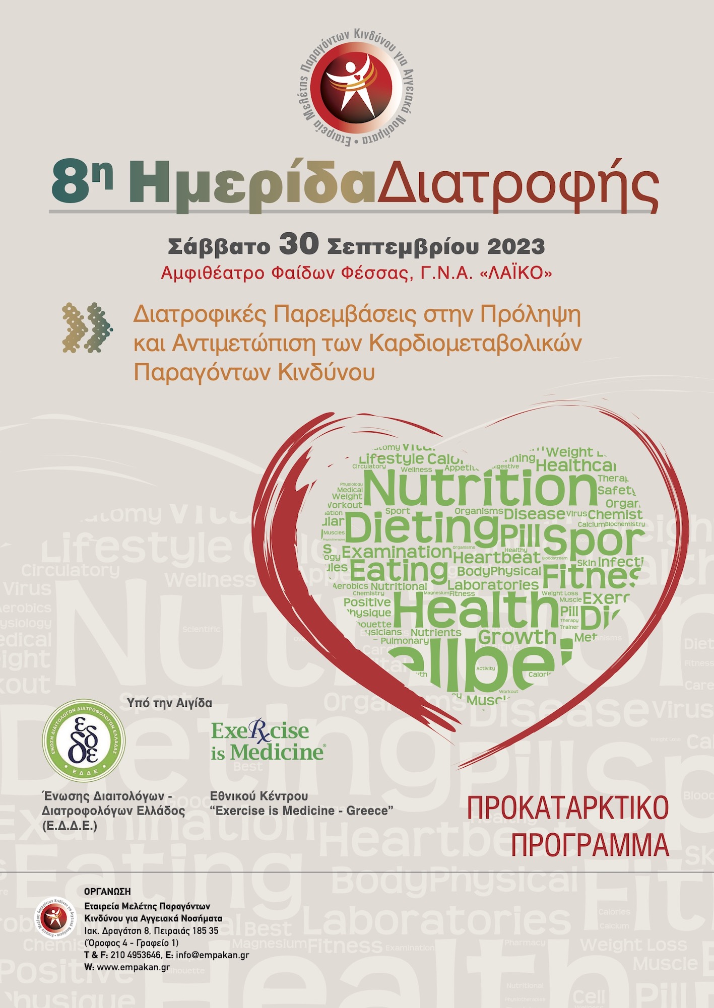 Μια αξιόλογη επιστημονική συνάντηση για τα θέματα διατροφής και καρδιαγγειακού κινδύνου, που απευθύνεται σε επαγγελματίες από το χώρο της υγείας και της διατροφής προγραμματίζει η Εταιρεία Μελέτης Παραγόντων Κινδύνου για Αγγειακά Νοσήματα (Ε.Μ.Πα.Κ.Α.Ν.) και το Τμήμα Διατροφής του ΓΝΑ «Λαϊκο». Πρόκειται για την επιστημονική εκδήλωση «8η Ημερίδα Διατροφής Ε.Μ.Πα.Κ.Α.Ν.» με θέμα: «Διατροφικές Παρεμβάσεις στην Πρόληψη και Αντιμετώπιση των Καρδιομεταβολικών Παραγόντων Κινδύνου».