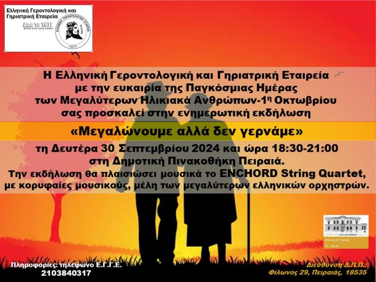 Με μια όμορφη πρωτοβουλία τιμά φέτος η Ελληνική Γεροντολογική και Γηριατρική Εταιρεία την Παγκόσμια Ημέρα Μεγαλύτερων Ηλικιακά Ανθρώπων που γιορτάζεται κάθε χρόνο την 1η Οκτωβρίου. Τη Δευτέρα 30 Σεπτεμβρίου 2024 και ώρα 18.30-21.00 οργανώνει εκδήλωση στη Δημοτική Πινακοθήκη Πειραιά (Φίλωνος 29, Πειραιάς, Τ.Κ. 18535) με κεντρικό θέμα «Μεγαλώνουμε αλλά δεν γερνάμε!».