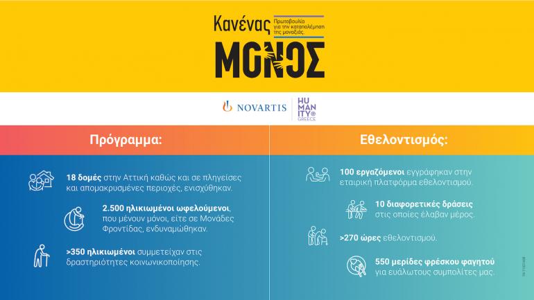 Από την αρχή του έτους 2024 η Novartis Hellas προωθεί το εξαιρετικό πρόγραμμα εταιρικής υπευθυνότητας «Κανένας Μόνος» που ενίσχυσε την ψυχική υγεία και βελτίωσε την ποιότητα ζωής χιλιάδων ηλικιωμένων. Με την υποστήριξη του Humanity Greece, το πρόγραμμα τόνωσε το αίσθημα κοινωνικής αλληλεγγύης και ανέδειξε το ζήτημα της μοναξιάς στην Τρίτη Ηλικία, αναδεικνύοντας τον ανθρωποκεντρικό προσανατολισμό της εταιρείας.