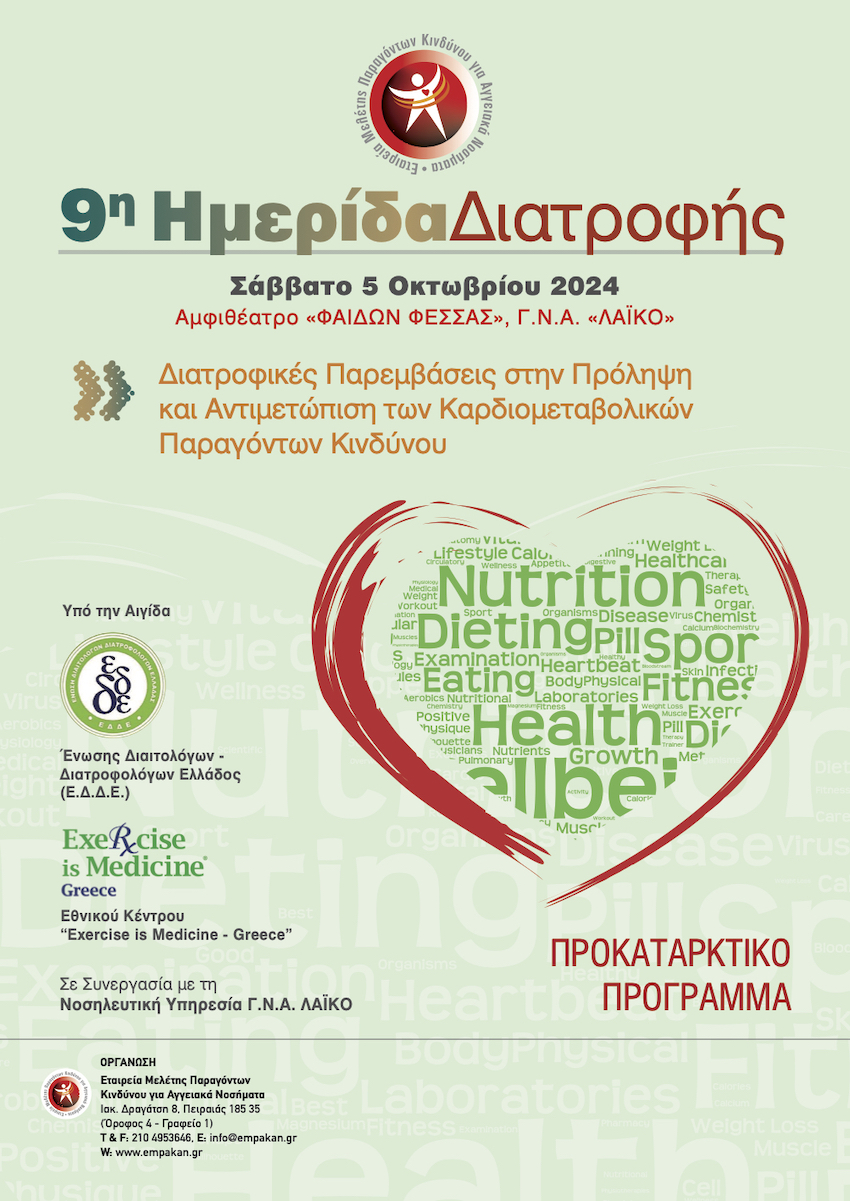 Μια καλή ευκαιρία για ενημέρωση και ανταλλαγή απόψεων πάνω σε θέματα διατροφής και καρδιαγγειακού κινδύνου προσφέρει σε επαγγελματίες του χώρου της υγείας και της διατροφής η «9η Ημερίδα Διατροφής» που οργανώνει η Εταιρεία Μελέτης Παραγόντων Κινδύνου για Αγγειακά Νοσήματα (Ε.Μ.Πα.Κ.Α.Ν.) και το Τμήμα Διατροφής του Γ.Ν.Α. Λαϊκό.
