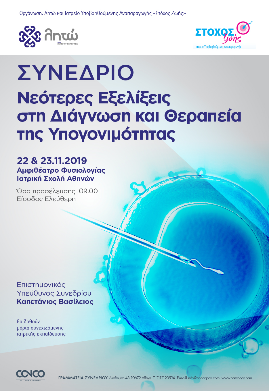 Το συνέδριο «Νεότερες Εξελίξεις στη Διάγνωση και Θεραπεία της Υπογονιμότητας» διοργανώνεται για πρώτη φορά από το Ιατρείο Υποβοηθούμενης Αναπαραγωγής «Στόχος Ζωής» και το «Λητώ», με σκοπό να φέρει σε επαφή διακεκριμένους επιστήμονες στο χώρο της υπογονιμότητας (Γυναικολόγους, Εμβρυολόγους, Γενετιστές, Ανδρολόγους, Ενδοκρινολόγους, Παιδιάτρους, Μαίες), με το ευρύτερο κοινό των γιατρών, βιολόγων, παραϊατρικού προσωπικού, μαιών που ενδιαφέρονται να πληροφορηθούν για τα τελευταία δεδομένα στο ταχύτατα αναπτυσσόμενο πεδίο της ανθρώπινης υπογονιμότητας.
