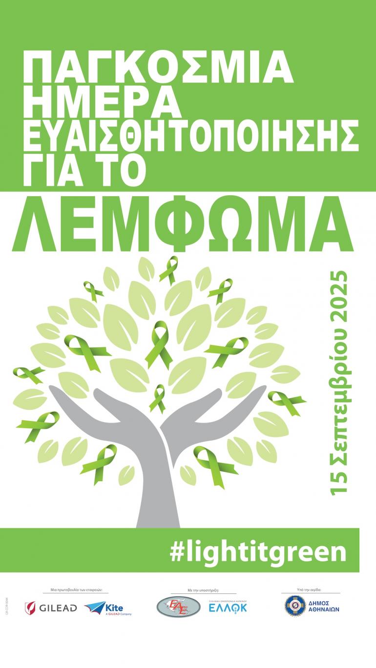 Η 15η Σεπτεμβρίου, Παγκόσμια Ημέρα Ευαισθητοποίησης για το Λέμφωμα, υπενθυμίζει ότι η έγκαιρη διάγνωση και η ενημέρωση μπορούν να κάνουν τη διαφορά στη ζωή των ασθενών. Στην Ελλάδα, για ακόμη μια χρονιά, το μήνυμα αυτό εκπέμπει η εκστρατεία «Light It Green», που προωθεί η Gilead Sciences σε συνεργασία με την Ελληνική Αιματολογική Εταιρεία και την ΕΛΛΟΚ – Ελληνική Ομοσπονδία Καρκίνου, με την αιγίδα του Δήμου Αθηναίων.