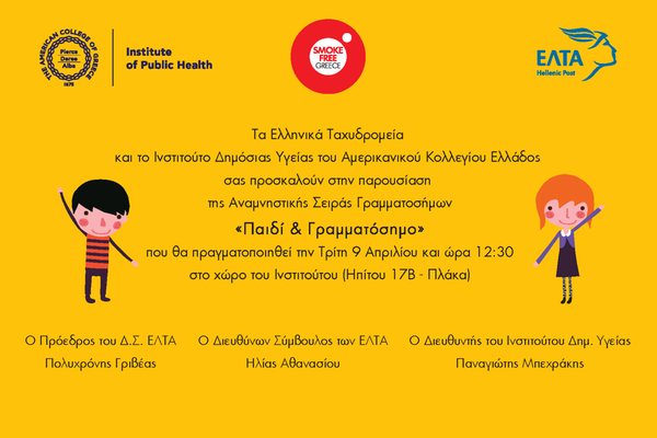 Την Τρίτη 9 Απριλίου 2019, ώρα 12:30, στην Πλάκα, στο Ινστιτούτο Δημόσιας Υγείας του Αμερικανικού Κολλεγίου Ελλάδας (Ηπίτου 17Β), τα Ελληνικά Ταχυδρομεία θα παρουσιάσουν τη νέα αναμνηστική σειρά γραμματοσήμων «Παιδί και Γραμματόσημο» στην οποία θα περιλαμβάνονται δύο διαφορετικά γραμματόσημα της πρωτοβουλίας SmokefreeGreece, αλλά και άλλο υλικό που σχεδιάστηκε για την προώθηση της πρόληψης του καπνίσματος και θα είναι διαθέσιμο σε μαθητές και στο κοινό.