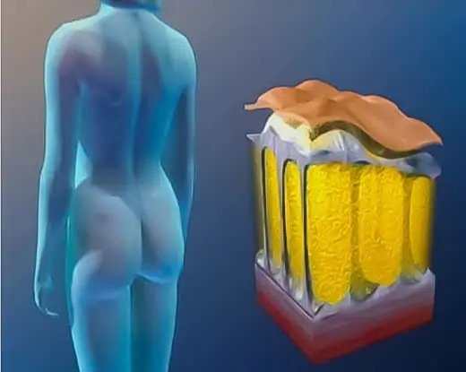 Στην Εικόνα Γ βλέπουμε ότι το λίπος στους μηρούς της γυναίκας είναι αποθηκευμένο ανάμεσα σε στήλες συνδετικού ιστού και είναι ένας απο τους βασικούς λόγους που σχηματίζονται κυματισμοί στο δέρμα όταν αυξηθεί το λίπος. Αντίθετα στους άντρες ο συνδετικός ιστός είναι δομημένος χιαστί και είναι ένας απο τους βασικούς λόγους που είναι πιο δύσκολο να εμφανιστεί ανομοιομορφία στην επιφάνεια του δέρματός τους.