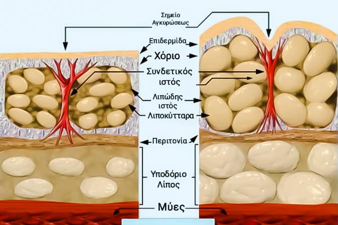 - Υπόδερμα (ή αλλιώς υποδόριος ιστός) όπου ανιχνεύεται η κυτταρίτιδα